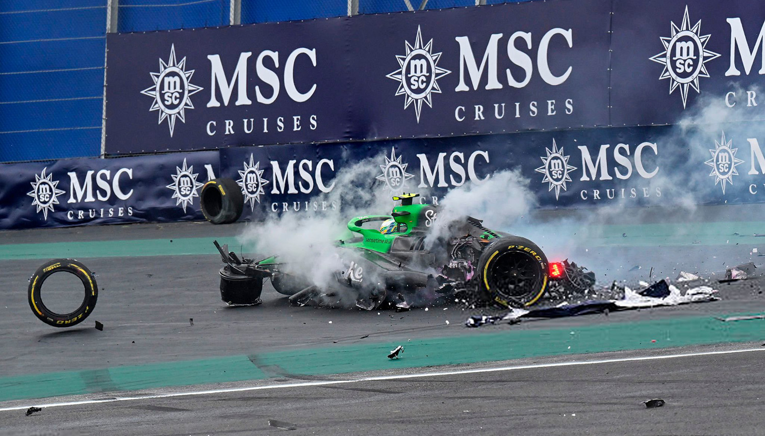 - Altıncı turda kerblere taşan Oscar Piastri bariyerlerde kaldı ve yarışa veda etti. Sonrasında da Franco Colapinto ve Nico Hulkenberg de aynı yerde kaza yaptılar. Colapinto yarış dışı kalırken, Hulkenberg devam etti. Kazalar sonrasında 7. turda kırmızı bayrak çıktı.