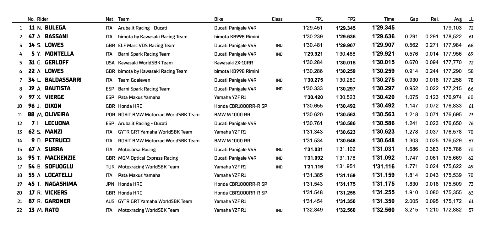Bulega’nın en yakın takipçisi, Bimota by Kawasaki Racing Team adına yarışan Axel Bassani oldu. Bassani, 1:29.636 ile liderin sadece 0.291 saniye gerisinde ikinci sırayı aldı. Takım arkadaşı Alex Lowes ise kombine klasmanda ilk altıda yer aldı.