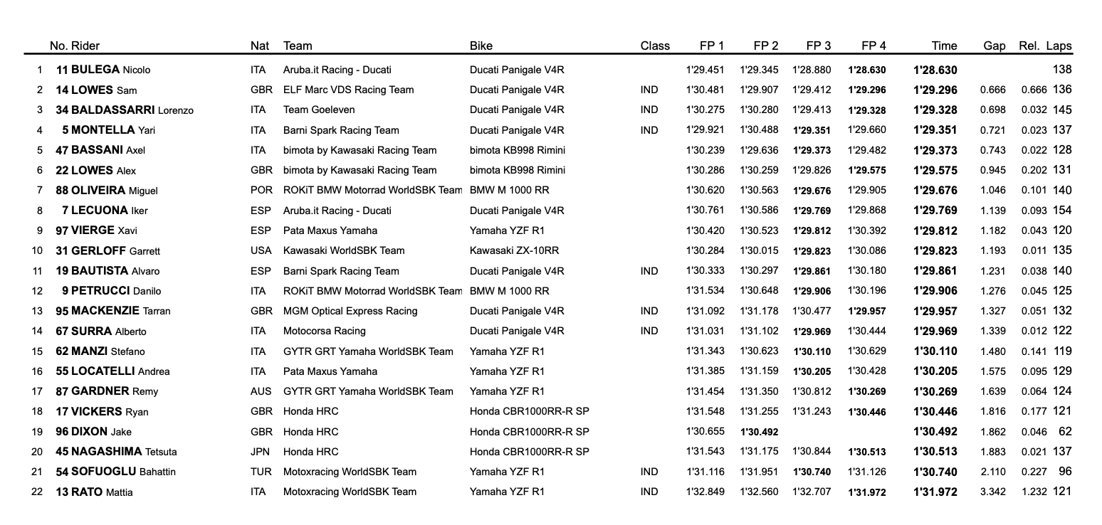 Ducati dominasyonunu bozan ilk isim, Bimota ile yarışan Axel Bassani oldu. Bassani dördüncü sırayı alırken takım arkadaşı Alex Lowes hemen arkasında yer aldı ve Bimota iki motosikletle ilk altıda testleri tamamladı.